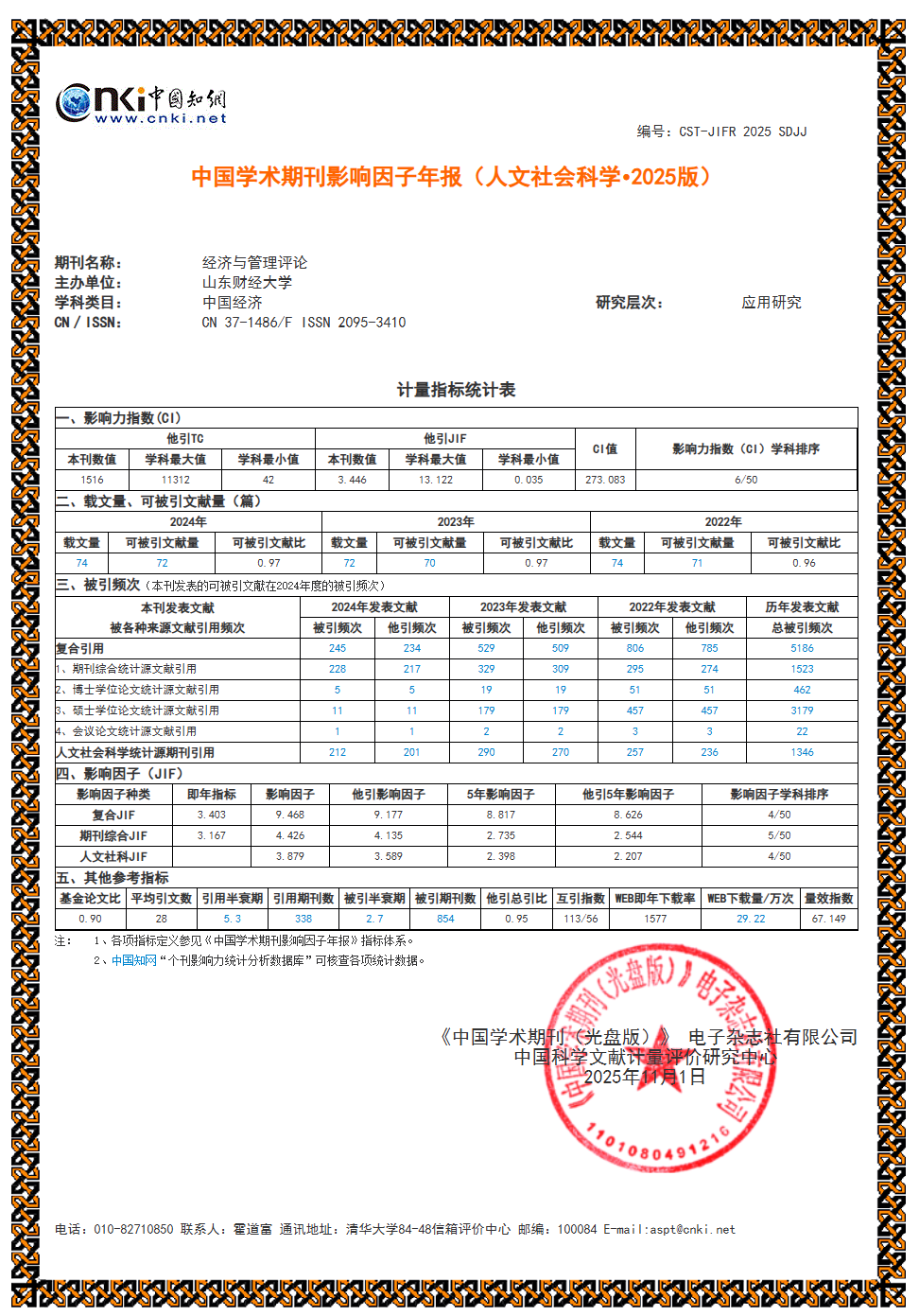 近日,中国知网发布了《中国学术期刊影响因子年报(人文社会科学·2025版)》。年报显示,《经济与管理评论》各项指标再创新高。复合影响因子由2024年的7.243提高至2025年的9.468,综合影响因子由2024年的3.838提高至2025年的4.426。在学科类目“中国经济”中,复合影响因子学科排序4/50,综合影响因子学科排序5/50,影响力指数(CI)学科排序6/50。期刊影响因子逐年提升趋势明显,标志着《经济与管理评论》正朝着高水平期刊稳步迈进。