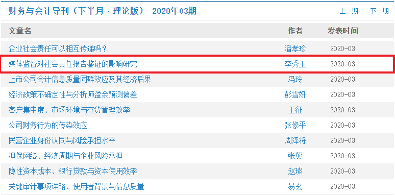 《经济与管理评论》2019年第6期的刊文《媒体监督对社会责任报告鉴证的影响研究》(作者:李秀玉、李倩雯、史亚雅;责任编辑:杨磊)被中国人民大学书报资料中心复印报刊资料《财务与会计导刊(理论版)》2020年第3期全文转载。