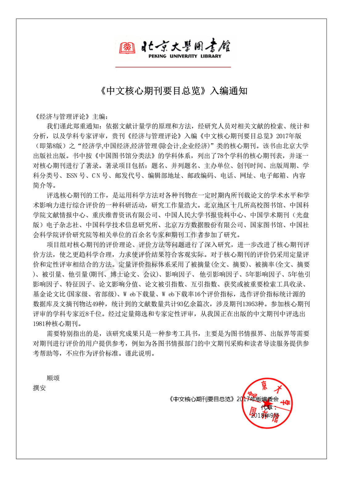 近日,从北京大学图书馆传来喜讯,经研究人员对相关文献数据的检索、统计和分析,以及学科专家评审,《经济与管理评论》入选北大中文核心期刊,入编由北京大学出版社出版的《中文核心期刊要目总览》2017年版(即第8版)之“经济学,中国经济,经济管理(除会计,企业经济)”类的核心期刊。